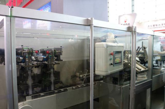 “在不改变原有输送线稳定线速度的基础上,DHL500高速泡罩装盒一体机实现了单轨至双轨产量的倍增,实现了泡罩装盒包装产量的大化。”工作人员介绍,这款设备有很多创新点,比如实现一体机内外包分体组合式设计,解决了国内使用客户一体机内外包。